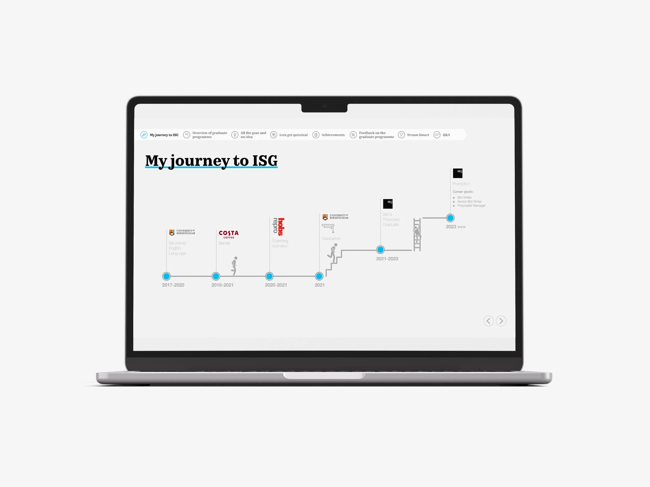 Amber was nearing the end of her training at ISG and needed a presentation to present to the board of directors in order to secure a future position at the company. I worked closely with Amber to develop the content which was interactive and presented in a clean and concise way. Amber went on to secure a position as Junior Bid Writer at the company.